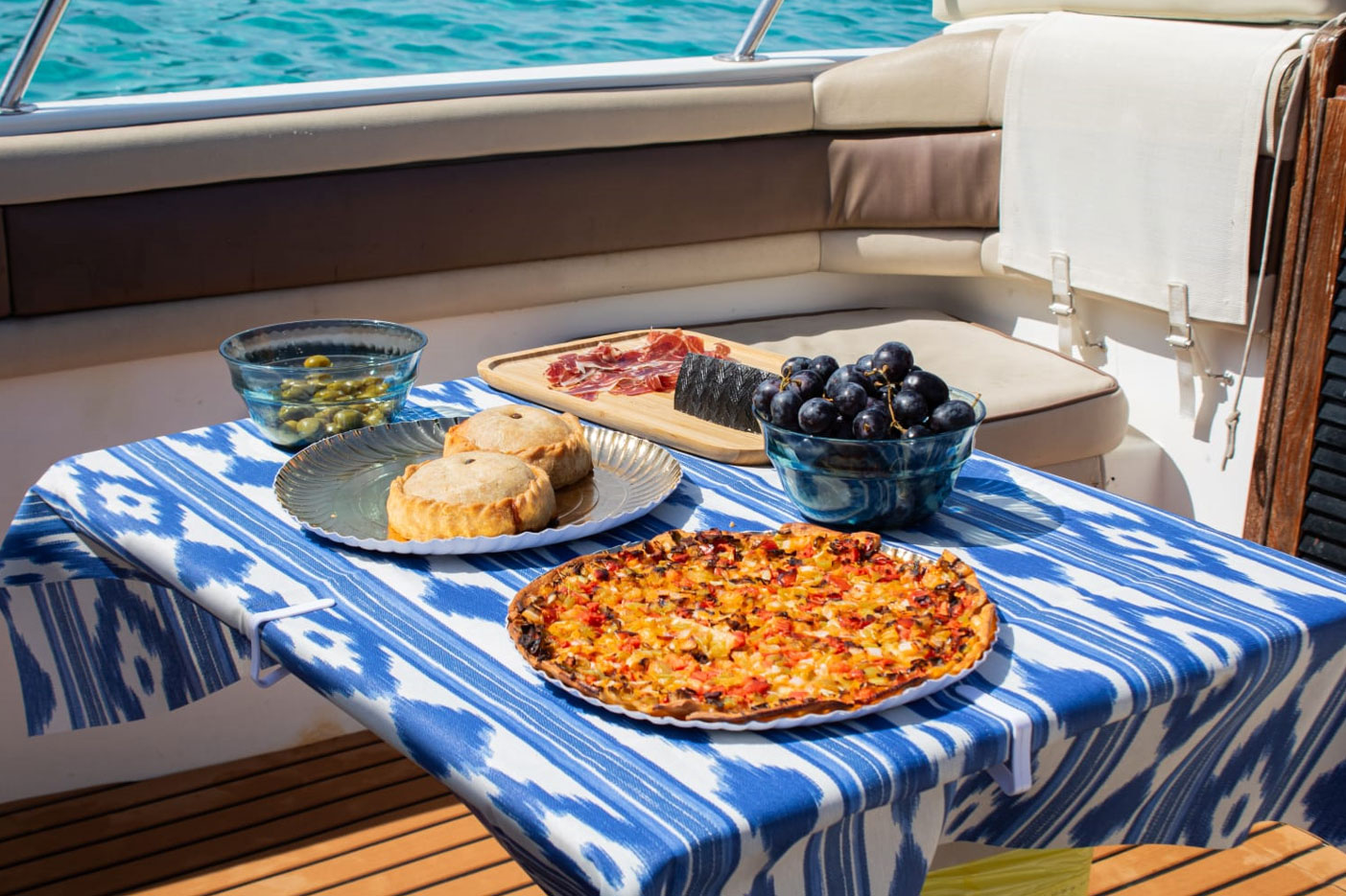 - Mallorquinisches Fingerfood: Coca de Trampó, mallorquinische Empanadas, Aufschnitt, Toast und Obst